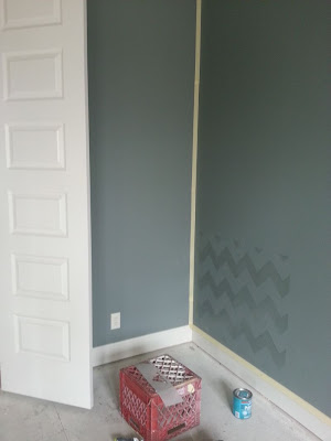 In retrospect, we would base paint the walls in a HIGH GLOSS BASE COLOR first. Then we would still use the chevron stencil with flat paint in the same color. Skip the clear coat. Trust me on this.