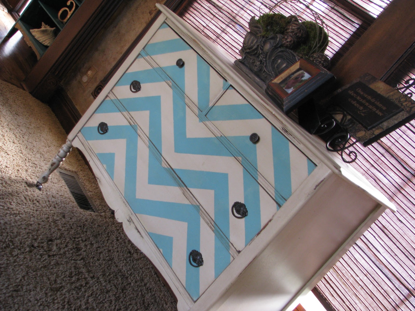 Because we were using a high gloss poly for the chevron….Jeri would paint in the little triangles and then when we would shift the stencil over, she would have to paint that triangle even bigger. Well, because the poly was high gloss….you could see every stop and start line in her application. You could see the “touch ups”. You could see the overlapping of clear coat.