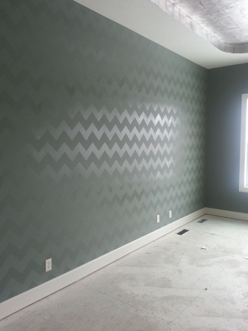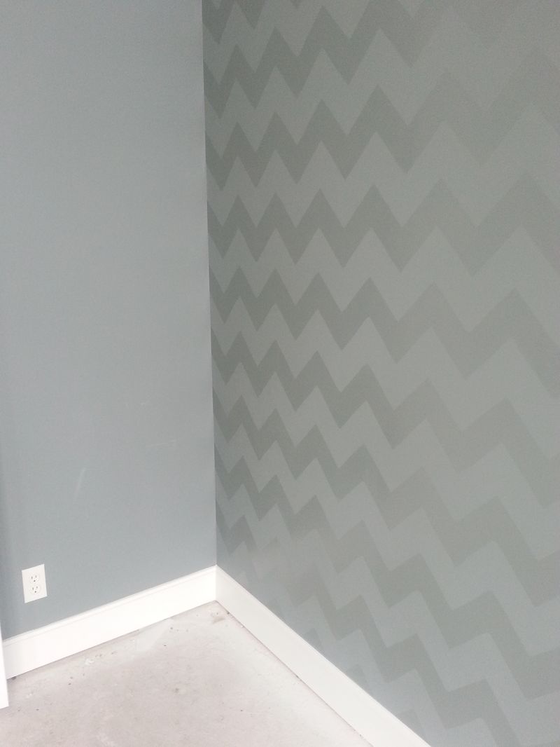 In retrospect, we would base paint the walls in a HIGH GLOSS BASE COLOR first. Then we would still use the chevron stencil with flat paint in the same color. Skip the clear coat. Trust me on this.