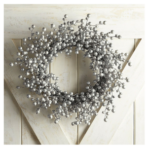 We finished off the decor by sticking a glitter silver wreath in the middle of a wreath I have had for many years. I keep the stick wreath on this wall of windows, but throwing another smaller wreath in the middle of it just adds so much flash! I also found this gorgeous silver berry wreath here.
