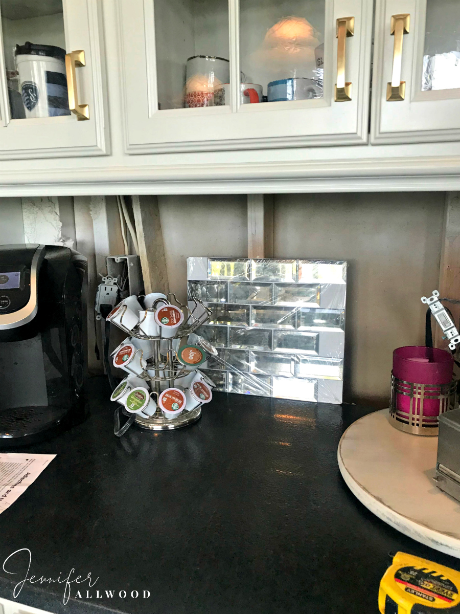So we picked out a different countertop for the coffee bar. The counter is supposed to look like soapstone without all of the upkeep of soapstone. We got it from Miller’s Custom Cabinets in Excelsior Springs, Missouri.