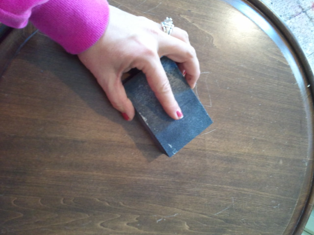 So, first you sand your piece. Or use a liquid deglosser on it. The point is not to take off the stain, but just to knock down the poly coat on the piece.