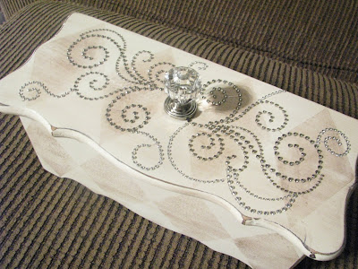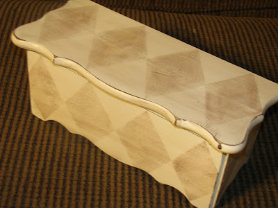 I sprayed the box all over with Heirloom White. Next I taped off diamonds and glazed them. Then I ran a sanding block over the whole thing to age it….especially the corners.