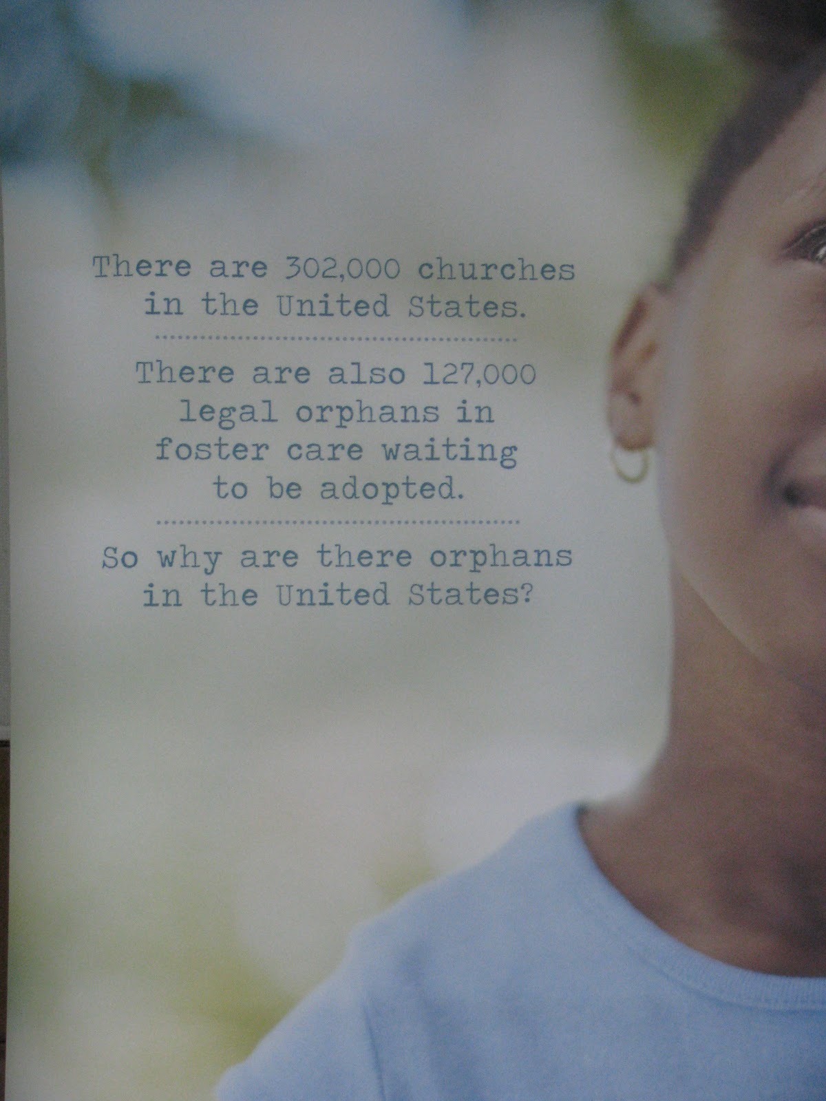 Last month, I traveled to Orange County, CA with 2 amazing women from my church. We attended the Orphan Summit at Saddleback Church (the head pastor is Rick Warren…author of ‘Purpose Driven Life’). I was surrounded by 1800 like-minded people….all of whom have a passion for children / adoption /foster care. And after that experience, I am convinced more than ever that the plight of the orphan is the heartbeat of our Lord.