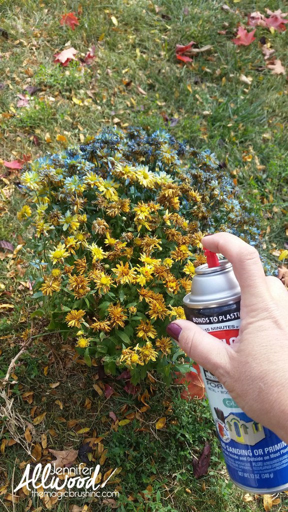 I honestly didn’t know this was a “thing”. My mums died while we were on vacation- well before Halloween. I thght I was just being cheap when I spray painted mine. I sprayed them the colors they originally were; yellow flowers & green stems and leaves. But now I will be spraying my ferns for Christmas. Great minds think alike.