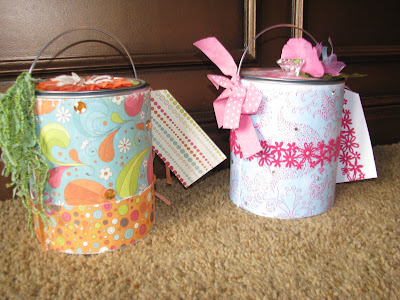 Bling the bucket out with beads, buttons, yarn, embellishments, a gift tag, etc. I purchased a broken knob from Hobby Lobby to hot glue to the top of this pail. (one of the girls at the last party suggested it! Way cute idea!)