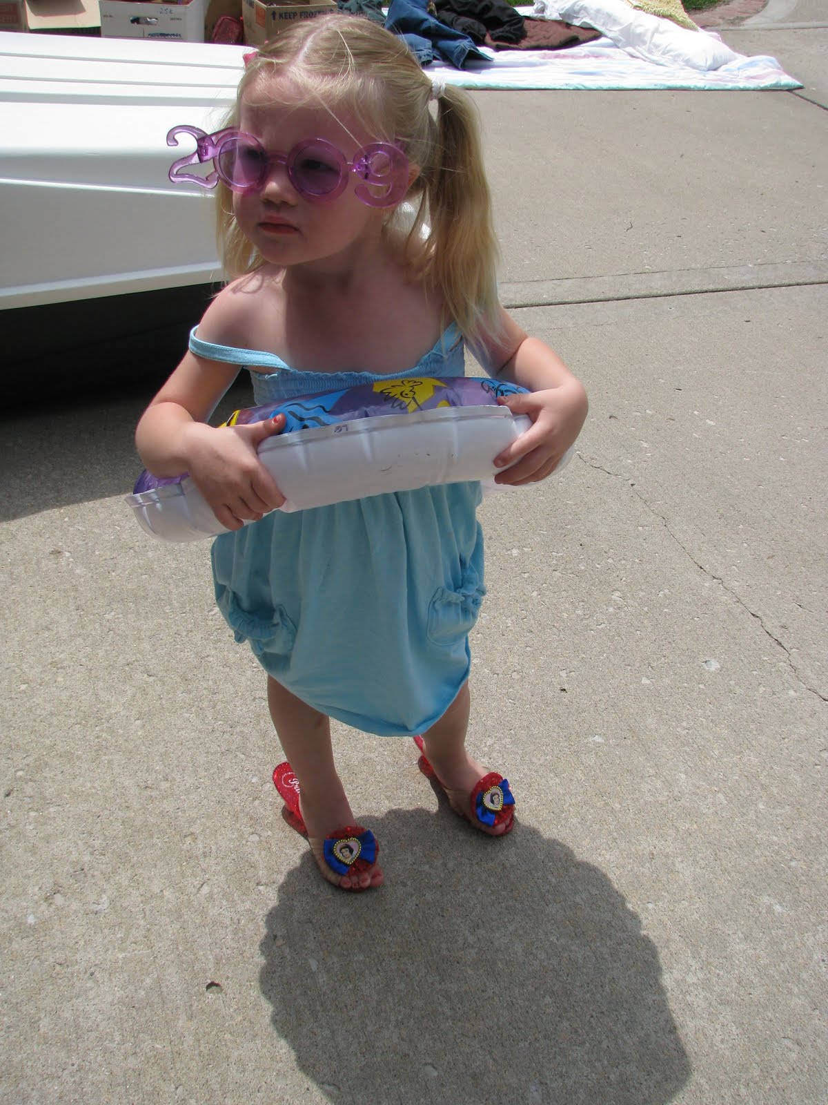 Ava scored some princess shoes, a pool ring and some “2009” sunglasses. When I say “Ava scored”…. I mean “it was going home with us ‘cuz Ava refused to take any of it off”.
